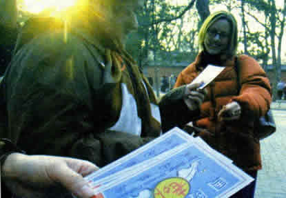 信报讯(记者李谱…..)昨天, 20多位金发碧眼的”老外”来到月坛公园,把自制的春贺卡送给通到的每一位游人,而且还把着拳用中文说”新春快乐”.收到贺卡的人们都是一脸惊奇,有的也把拳回敬”同喜同喜”贺卡上印有”老外与您同贺新春”的中文.”老外两字是此次活动的缘起,发起人,德国留学生,古乐言用流利的中文说:”老外两字曾经给我们外国人带来很大的误会.”他说,中国人从不当面称呼外国人为”老外”,而是在背后”窃窃私语”时才用上这两个字,所以很多外国人都认为”老外”是一个贬义词.后来古乐言检询资料并多方咨询才知道,”老外”是中国人对外国人较为亲昵的一重称呼,也是称呼外国人时最常用的词.但由与是非正式称呼,中国人才不会在正式场会这样称呼外国人.“把`老外`端到桌面上来讲吧,这样我们的感觉会更好。古乐言这样说。因此,这些在中国工作,读书或旅游的“老外”们抓紧时间制作了一万份新春贺卡,正中印有“老外”两字,用了中国最常见的红黄暖色调;“老外”下面是一座